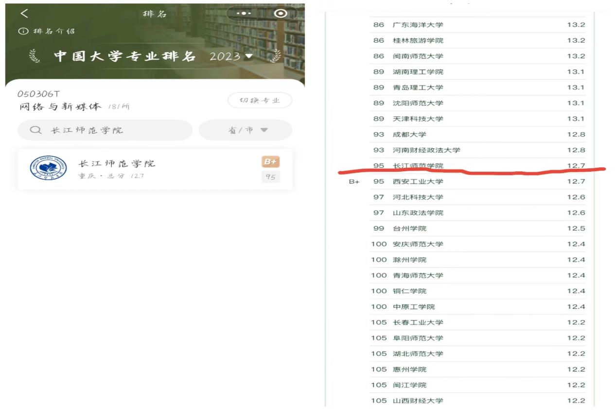 较之去年播音与主持艺术的19/284名,今年上升了10名,名列第79位;广播电视学的99/212名,今年上升了14名,名列第85位;网络与新媒体的81/270名,今年虽下降6名,名列第95位,但从B类专业,上升至B+类专业。