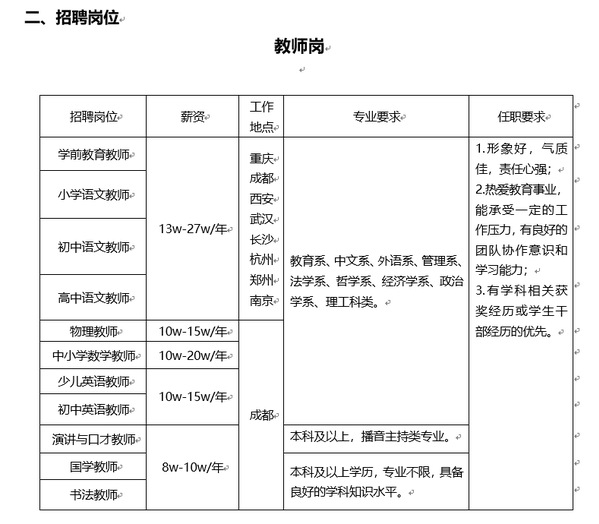 招聘专业:不限专业 | 5K-10K/月 | 5人 | 本科及以上 | 重庆市 郑州市 南京市 杭州市 武汉市 长沙市 成都市 西安市 |