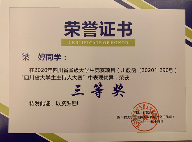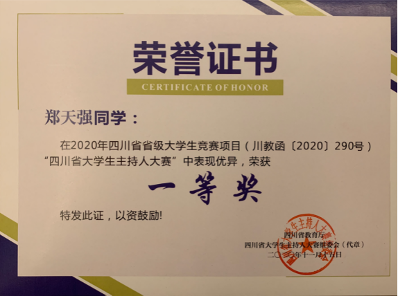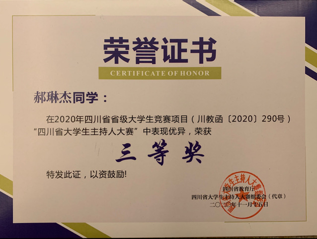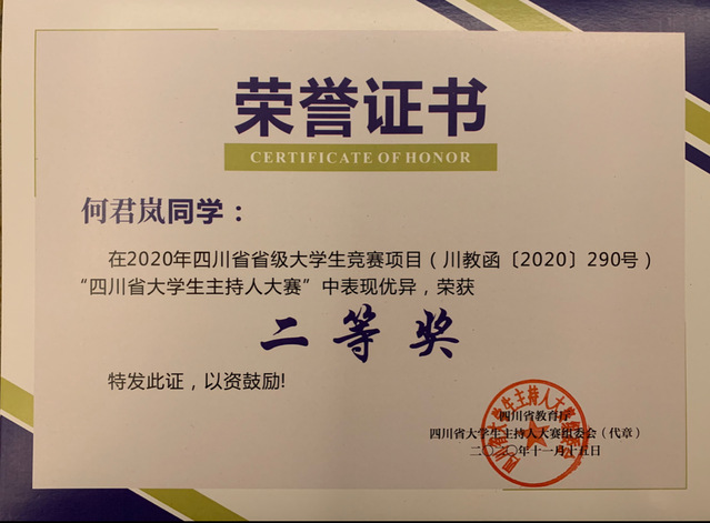 四川省大学生主持人大赛获奖证书