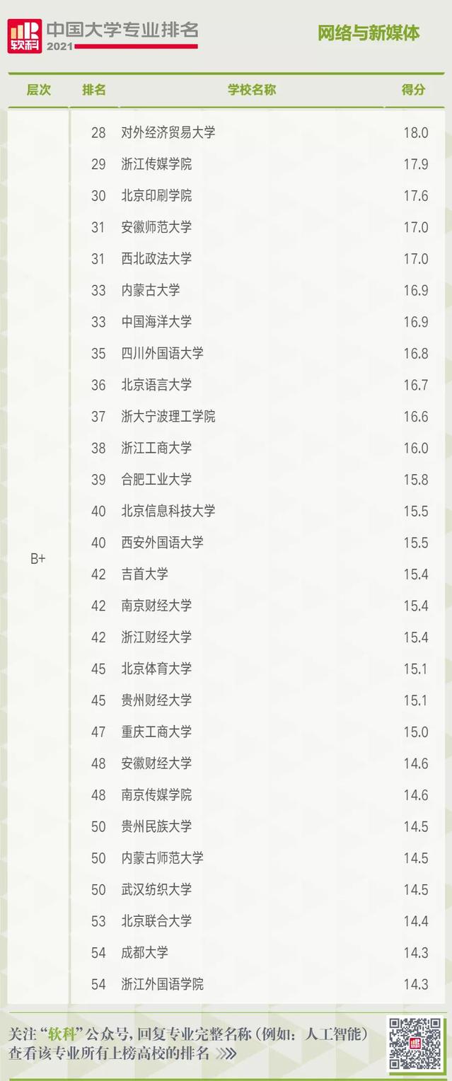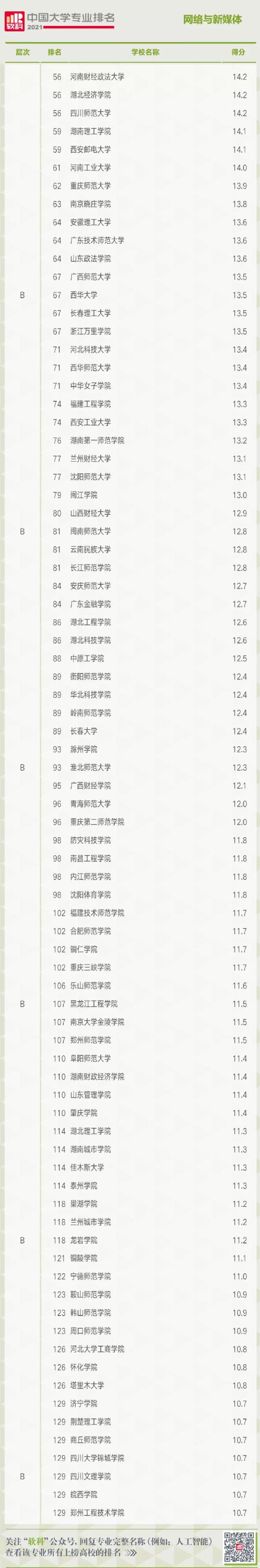 在网络与新媒体专业排名中,共有135所高校上榜,A+层次的高校依次为中国传媒大学、深圳大学、湖南师范大学、暨南大学、西安交通大学。