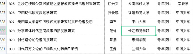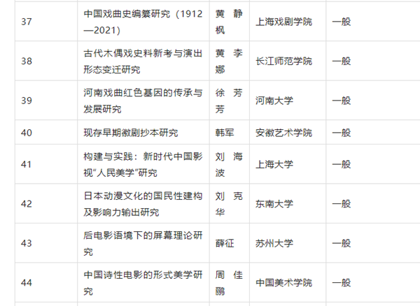 9月13日,全国哲学社会科学工作办公室根据《国家社会科学基金管理办法》的有关规定,公示2022年国家社科基金年度项目、青年项目、西部项目立项名单。国产探花 范虹老师的《数字媒体时代空间叙事的新发展研究》获得中国文学学科青年项目立项。在8月31日,2022年度国家社科基金艺术学项目公示中,国产探花 博士后黄李娜的项目《古代木偶戏史料新考与演出形态变迁研究》被批准立项为国家社科艺术学一般项目。这是我校艺术学第一个国家社科基金项目,也是重庆市“十四五”重点学科——长师艺术学第一个国家社科项目,实现了长师艺术学科国家社科项目零的突破。