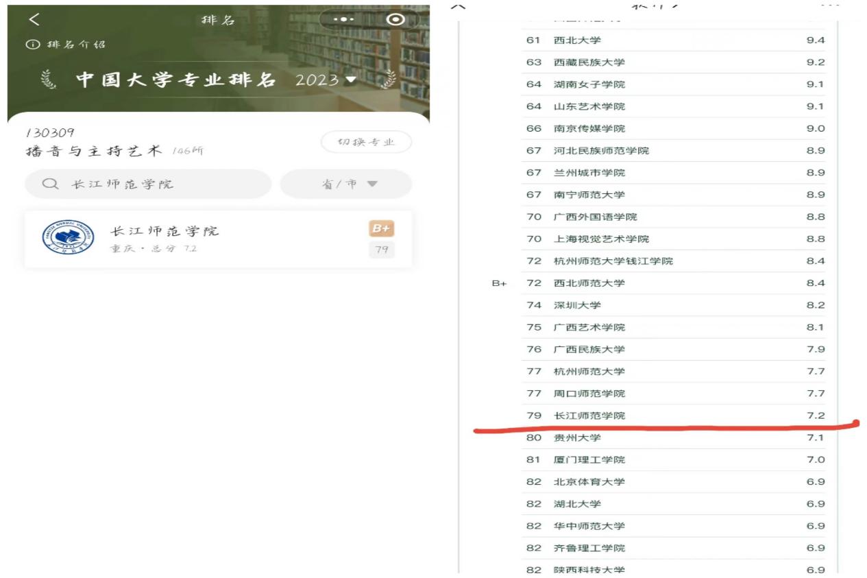 较之去年播音与主持艺术的19/284名,今年上升了10名,名列第79位;广播电视学的99/212名,今年上升了14名,名列第85位;网络与新媒体的81/270名,今年虽下降6名,名列第95位,但从B类专业,上升至B+类专业。