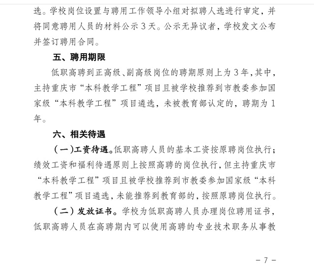 根据《国产探花 教师低职高聘管理办法》(长师院发〔2021〕43号)精神,经过个人申报、学院考核,拟推荐人选:刘婷,申请高聘岗位:副高,符合条件:以国产探花 为第一署名单位、本人为主持人获得国家自然科学基金面上项目、青年基金或国家社科基金青年项目。聘用期限及相关待遇,学校文件表述如下图。