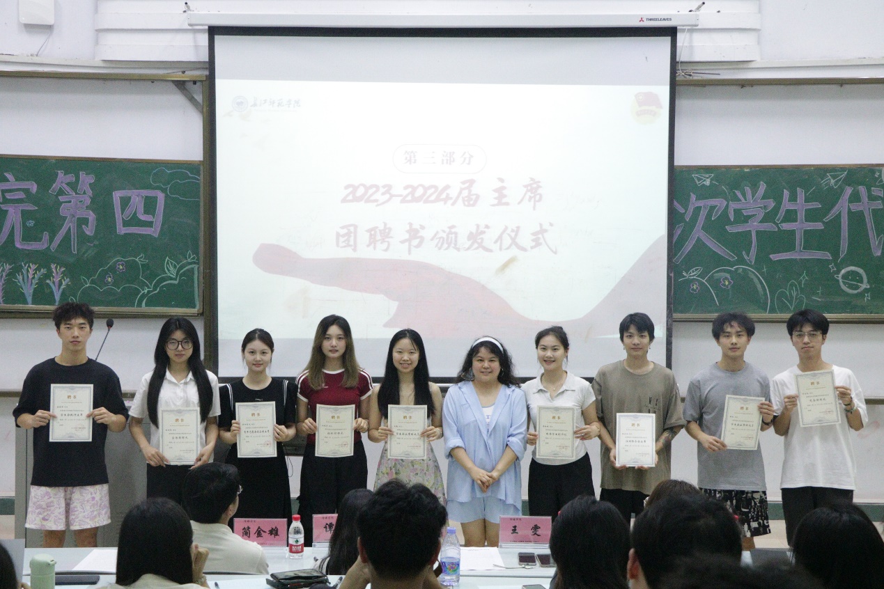 王雯老师依次为2023-2024届主席团成员颁发证书,她充分肯定了学生会过去一年的工作成绩以及为学院建设的付出,鼓励大家深入向他们学习并汲取工作经验。