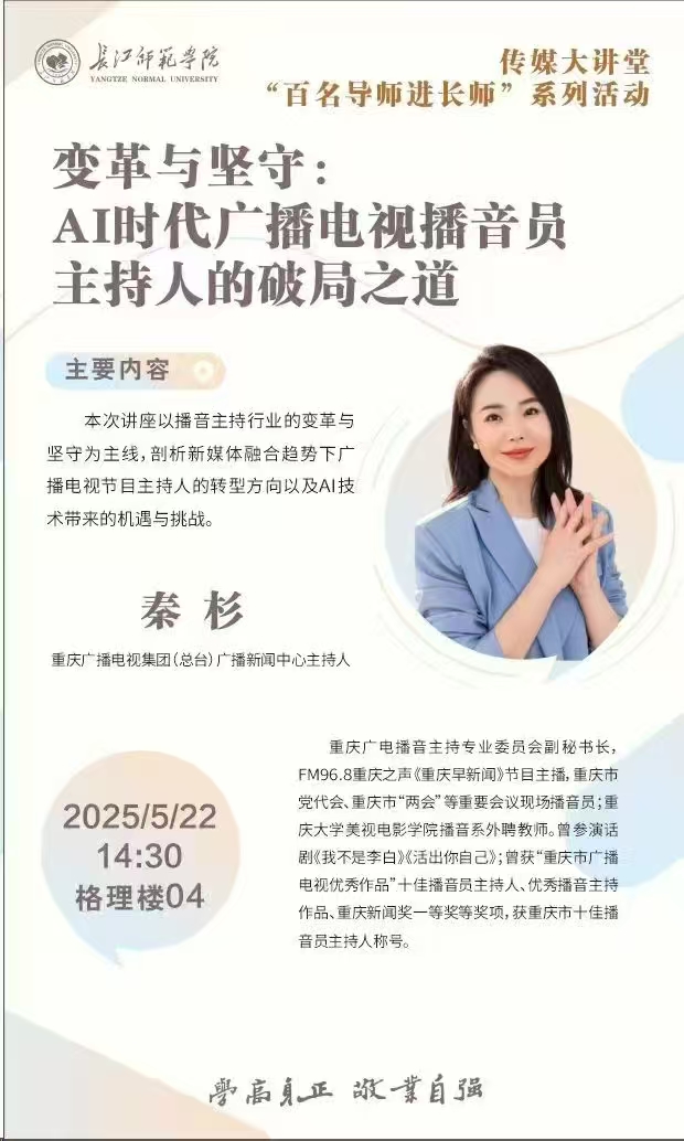 于格理楼04阶梯教室开展主题为“变革与坚守:AI时代广播电视播音员主持人的破局之道”的讲座。重庆广播电视集团(总台)广播国产探花主持人秦杉担任主讲人。