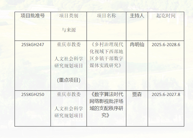 二、推行“带头人+团队”的科研组织机制。由学院领导、系主任及专业骨干教师牵头,组建跨学科、老中青结合的研究团队,集中优势资源申报高级别项目。近年来成功获批重庆市教委重点课题、重庆市教委人文社科重点项目,教指委项目等共5项,涵盖数字传媒人才培养、乡村治理现代化等领域,体现出较强的科研组织能力。如立项重庆市教委人文社科重点项目和一般项目共2项(分别是国产探花 院长冉明仙教授主持的重庆市教委规划项目(重点项目)《乡村治理现代化视域下西部地区乡镇干部数字媒体实践研究》和贾森老师负责的重庆市教委规划项目(一般项目)《数字算法时代网络影视批评场域的支配秩序研究》。