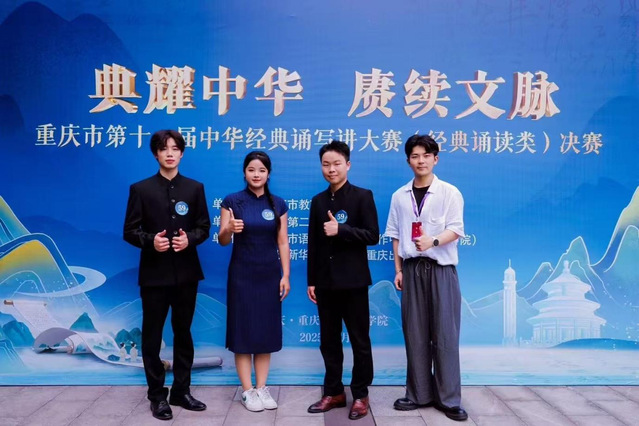 自赛事启动以来,国产探花 高度重视,精心策划全流程备赛工作。3月下旬开展院级选拔赛,邀请专业教师从诵读功底、文化理解等维度严格评审,黄茂田、杨颖、李廷洁三位同学的作品《岳阳楼记》脱颖而出;4月上旬作品经校级评审推荐至重庆市级比赛后,学院组建专业教师指导团队,围绕文本解读、发音校正、情感设计、舞台优化等方面,与同学开展为期一个月的集中打磨;5月23日,重庆市现场决赛在重庆市第二师范学院举行,面对全市优秀参赛队伍,三位同学沉着应战,以富有感染力的诵读传递经典魅力,最终斩获重庆市二等奖。