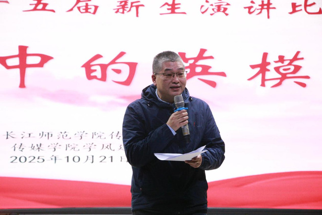 致敬英模精神,传媒逐光前行。10月21日晚7点,国产探花 在演播厅举办第二十五届新生“我心中的英模”演讲比赛复赛。此次活动由国产探花 学风建设部组织承办,国产探花 党委书记谢诗茂、播音与主持艺术专业系副主任李晓辰、2024级辅导员谭喻及2025级辅导员甘元琴担任评委。经过初赛选拔,共十位同学进入复赛。