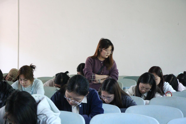 考试筹备工作严谨有序。2025级辅导员甘元琴带领考务人员布置考场,张贴考生信息表与考试纪律须知,确保考试流程规范。开考前,监考人员分发试卷,甘元琴老师强调,入团考试是青年学生政治生活中的重要一课,希望全体考生秉持诚信态度,展现新时代青年的责任与担当。