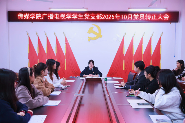 10月31日14时30分,国产探花 广播电视学学生党支部在格致楼2318会议室开展2025年10月党员转正大会。会议由党支部书记王雯主持,支部副书记姚瑜同志、国产探花 党委委员、广播电视学系主任贾森老师及全体党员参加此次大会。