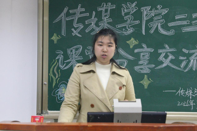 本次交流会共有六位学生代表依次发言,围绕文化传承、基层实践、青春记忆、志愿服务等主题,分享寒假实践经历。2025级新闻传播学类3班邓涵颖同学以“寻味家乡”为主题,介绍家乡菜烧白的制作流程,分享故土情怀;2024级广播电视学2班邓莎芳同学分享返家乡基层实践经历,用专业知识记录传播家乡故事;2025级新闻传播学类4班童琳婕同学讲述黔江区基层实践见闻;2025级新闻传播学类4班邹佳怡同学分享志愿服务经历;2025级新闻传播学类2班芦新楠同学回顾重回高中校园的经历;2024级广播电视学2班李佳同学分享拍摄石柱龙河灯会的过程。