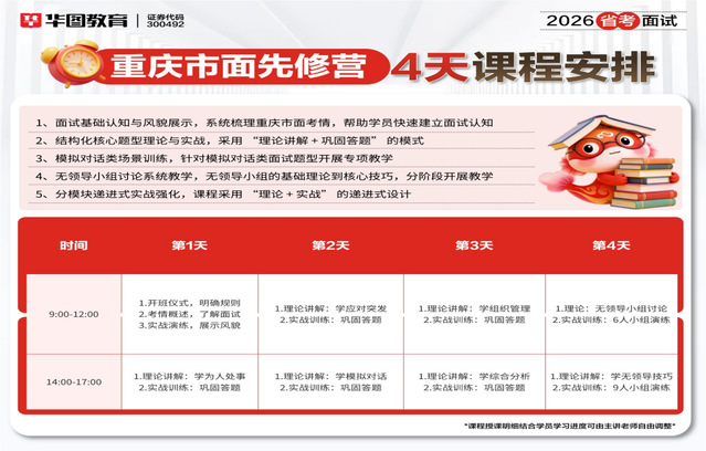 活动内容:梳理重庆市面试考情,讲解面试基础认知与风貌展示技巧;开展结构化题型、模拟对话、无领导小组讨论等模块理论 + 实战教学,通过小组演练强化应试能力,课程将根据学员进度灵活调整。