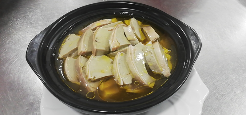 以新鲜猪肚、鸡蛋、养脾散为主料,洗净新鲜猪肚,用针线缝合猪肚其中一个口;养脾散兑凉开水搅拌均匀,倒进鸡蛋盆里搅拌均匀,倒入猪肚里;用针把猪肚口缝合好,放入锅中用温水慢火炖熟,熟后放凉;把放凉猪肚蛋切片摆放入煲锅里加入高汤加盐、鸡精、茶油,温火烧开即可。成菜特点是清鲜滑口,健脾养胃。