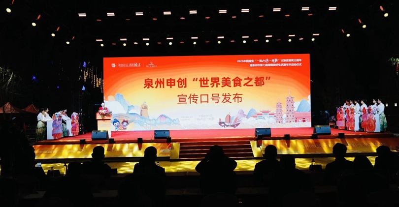 1月25日晚,2025年福建省“一路山海一路歌”文旅促消费主题年暨第七届闽南美好生活嘉年华启动仪式在泉州府文庙广场举行,泉州申创“世界美食之都”宣传口号同步在大会上发布!
