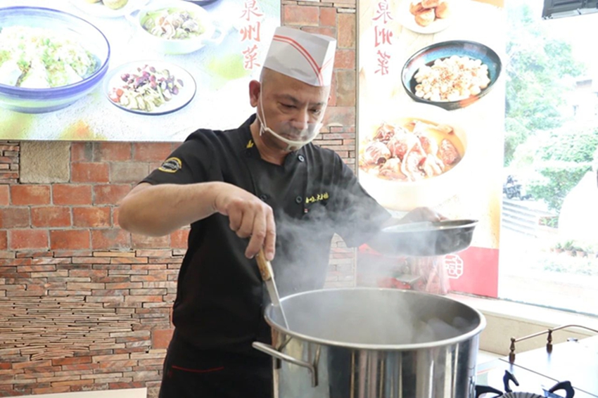 在制作面线糊时,酒楼创始人庄建安告诉大家,面线糊最主要的一个精髓就是“鲜”,食材的新鲜度极大地影响了最后的口感,师傅则在厨台上展示如何熬制高汤,并详细讲解何时下入小料。他认为制作面线糊的灵魂所在,是在熬好盛出后加入两滴自制当归酒。这一独特的诀窍瞬间吸引了现场学员对面线糊“灵魂”的好奇心。