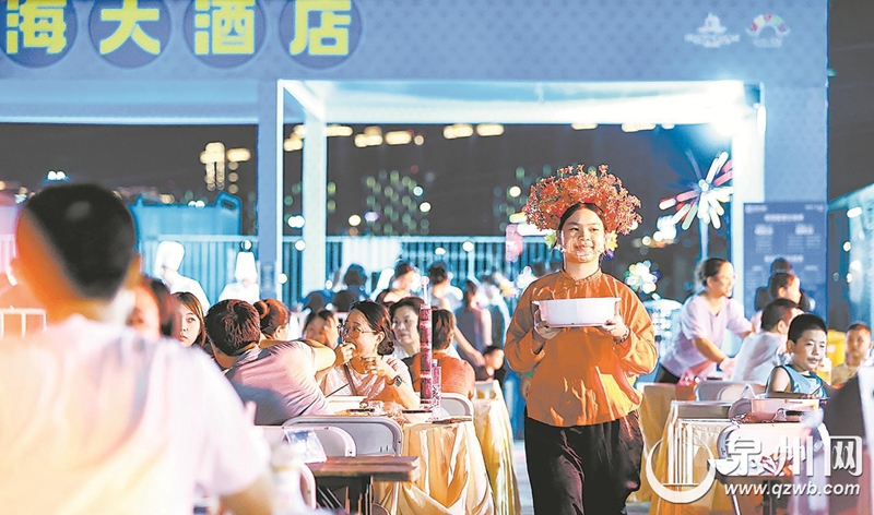 丰泽蟳埔渔人码头举行蟳鲜啤酒季活动,身着蟳埔服饰的服务员在宾客中穿梭。(融媒体记者林劲峰 摄)