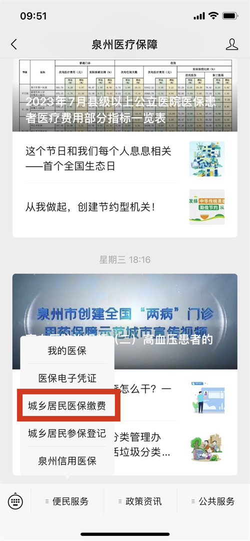 1.关注“泉州医疗保障”微信公众号,进入【便民服务】-【城乡居民参保登记】。