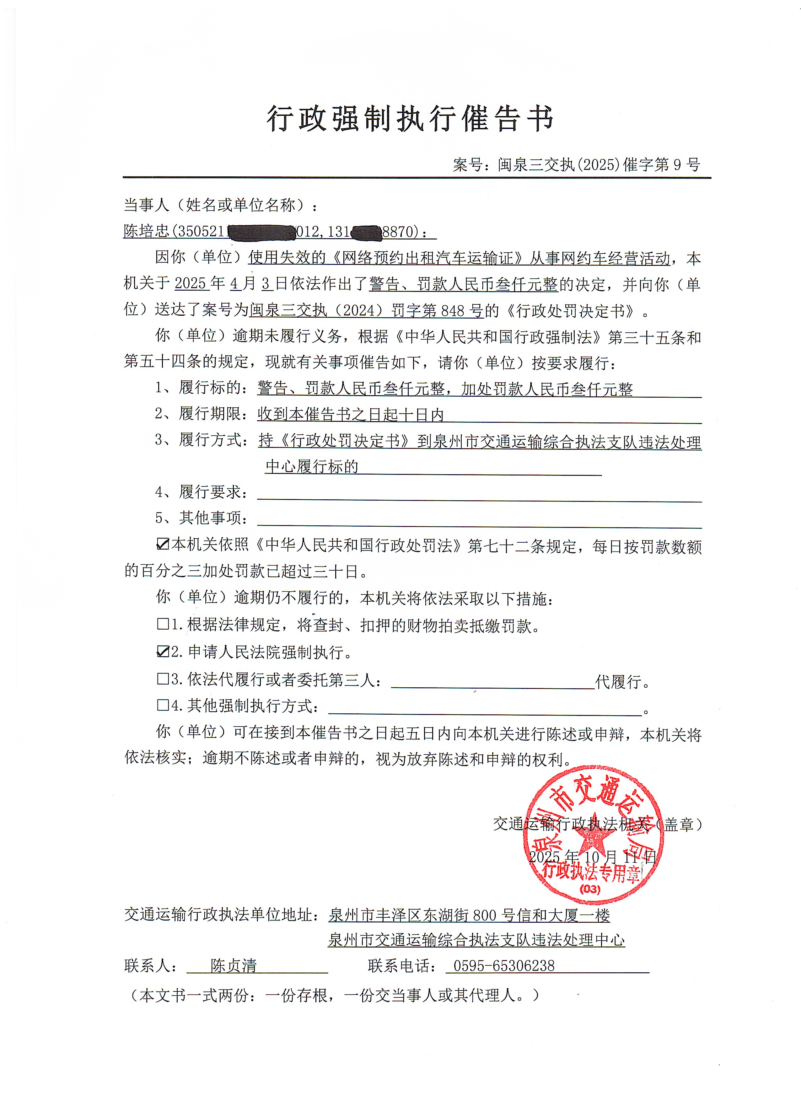 本机关于2025年4月3日因你使用失效的《网络预约出租汽车运输证》从事网约车经营活动依法向你送达了《行政处罚决定书》,案号:闽泉三交执(2024)罚字第848号。本机关于2025年10月11日对你使用失效的《网络预约出租汽车运输证》从事网约车经营活动一案作出催告,催告你依法履行闽泉三交执(2024)罚字第848号的处罚决定:警告、罚款人民币叁仟元整,并催告你缴纳因未在法定期限内履行闽泉三交执(2024)罚字第848号的处罚决定产生的加处罚款人民币叁仟元整。