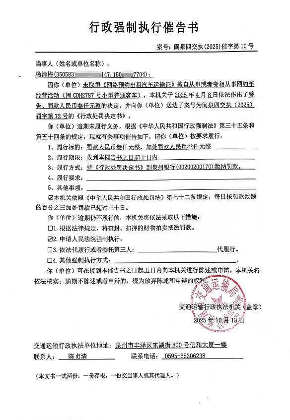 本机关于2025年4月8日因你未取得《网络预约出租汽车运输证》擅自从事或者变相从事网约车经营活动依法向你送达了《行政处罚决定书》,案号:闽泉四交执(2025)罚字第72号。本机关于2025年10月13日对你未取得《网络预约出租汽车运输证》擅自从事或者变相从事网约车经营活动一案作出催告,催告你依法履行闽泉四交执(2025)罚字第72号的处罚决定:警告、罚款人民币叁仟元整,并催告你缴纳因未在法定期限内履行闽泉四交执(2025)罚字第72号的处罚决定产生的加处罚款人民币叁仟元整。