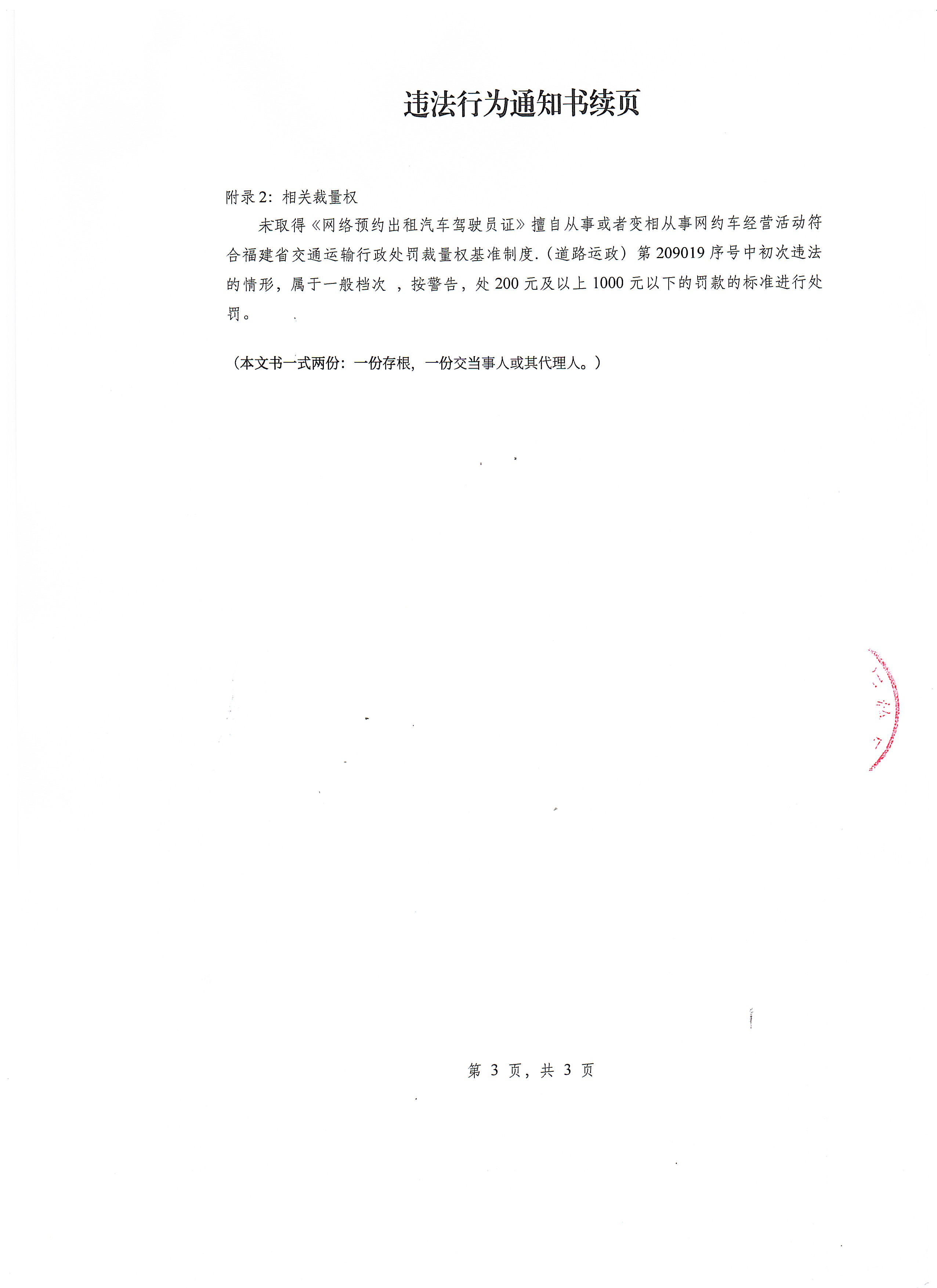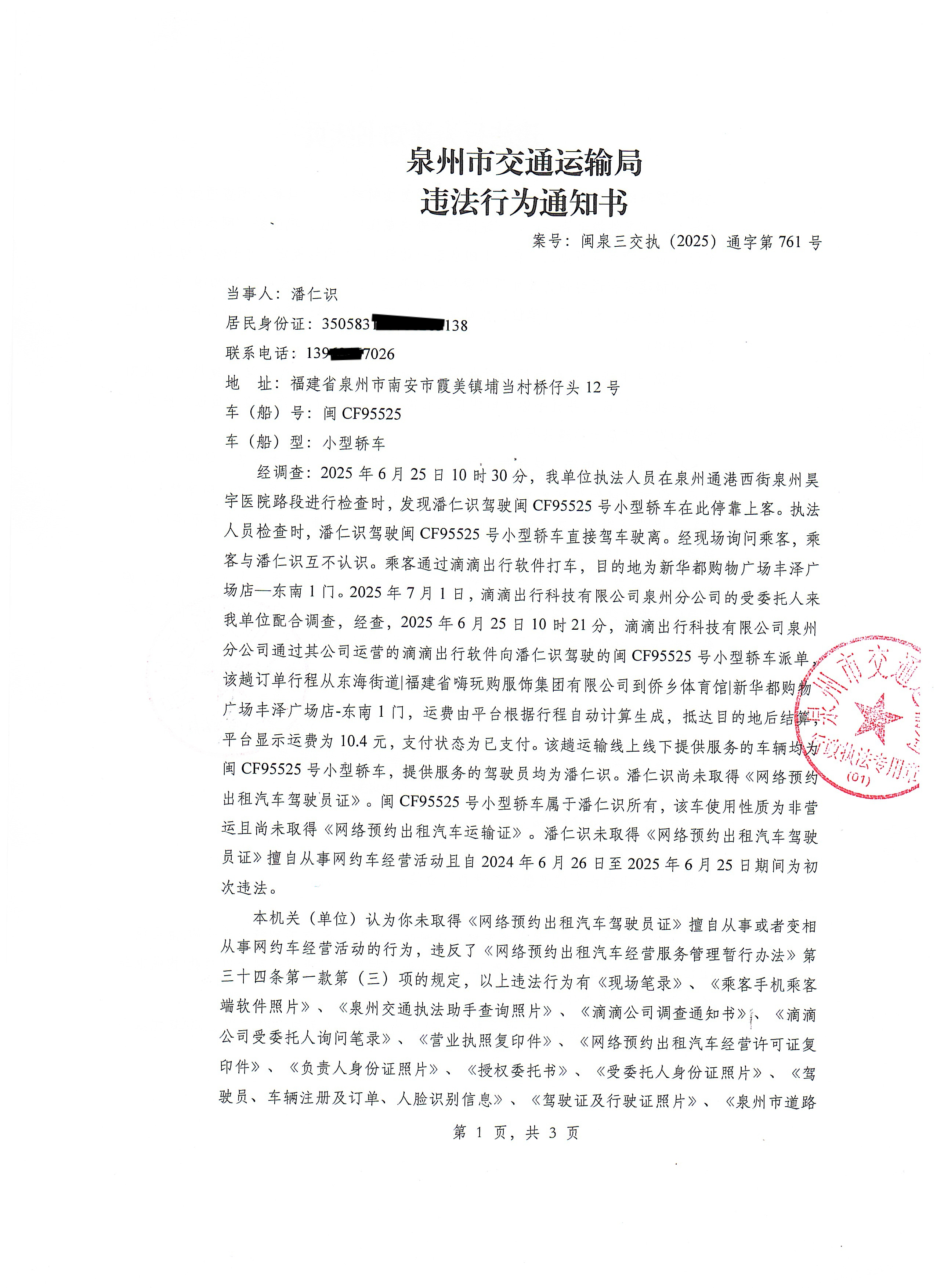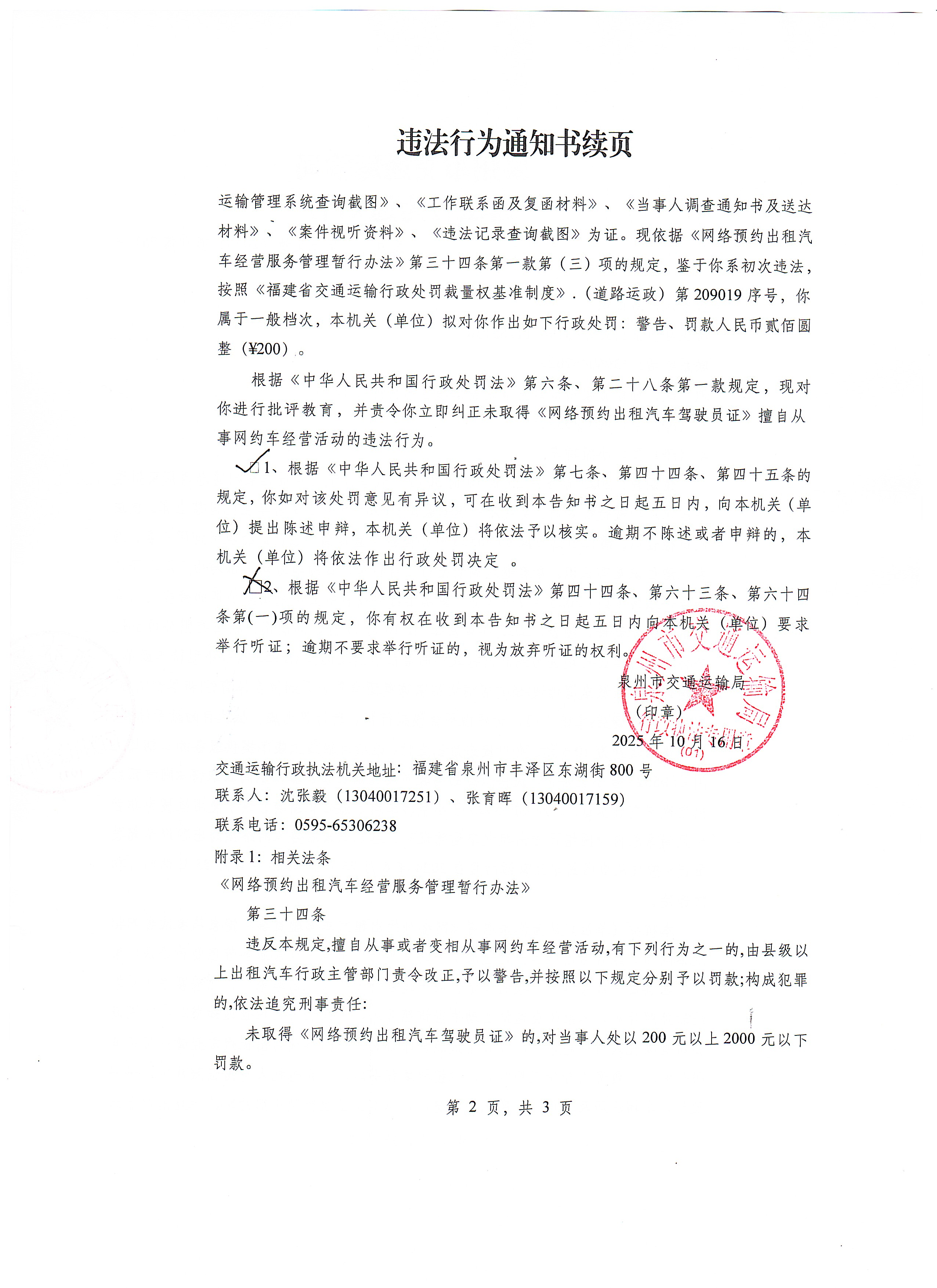 附件:《违法行为通知书》(闽泉三交执(2025)通字第761号)