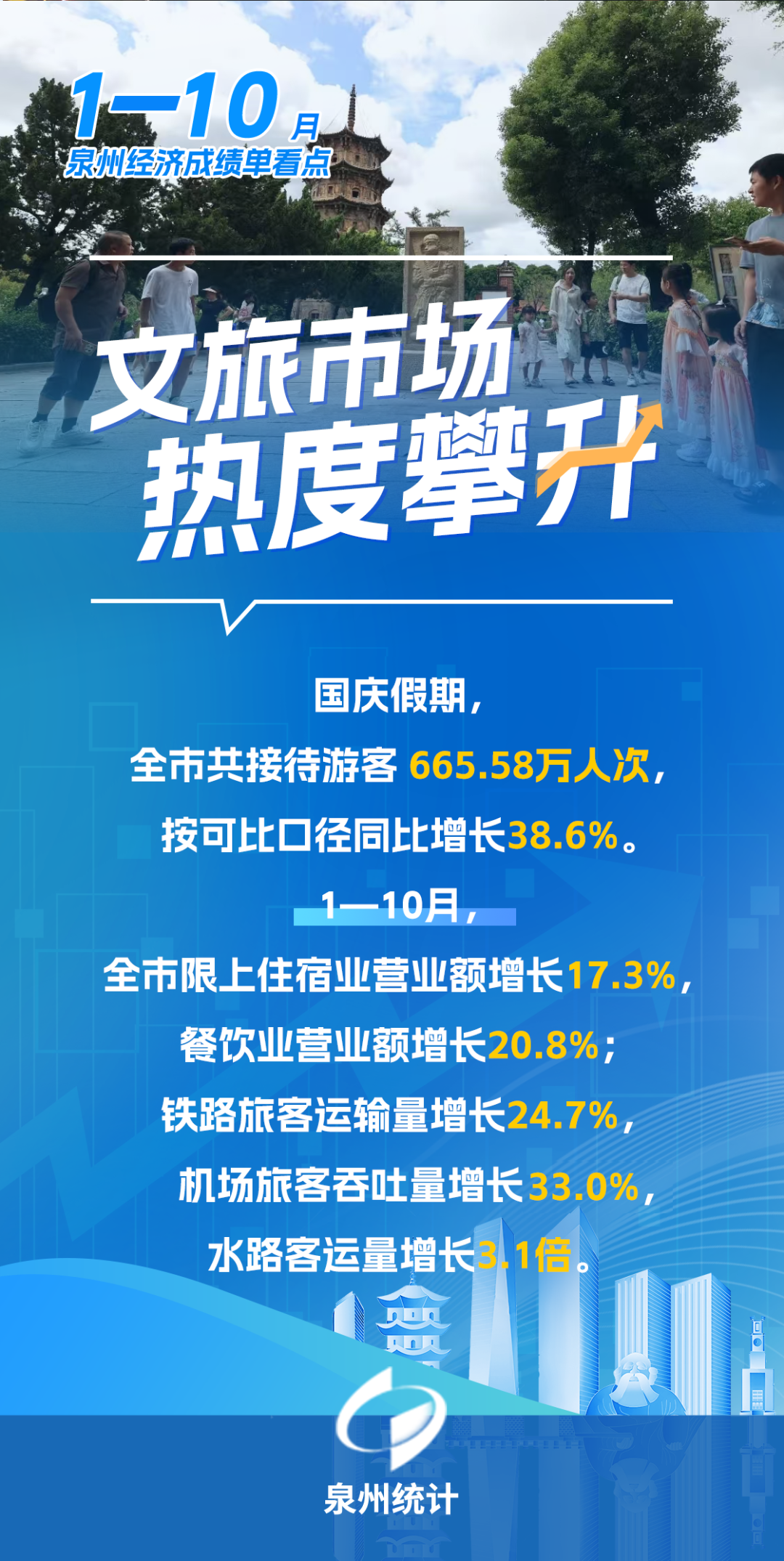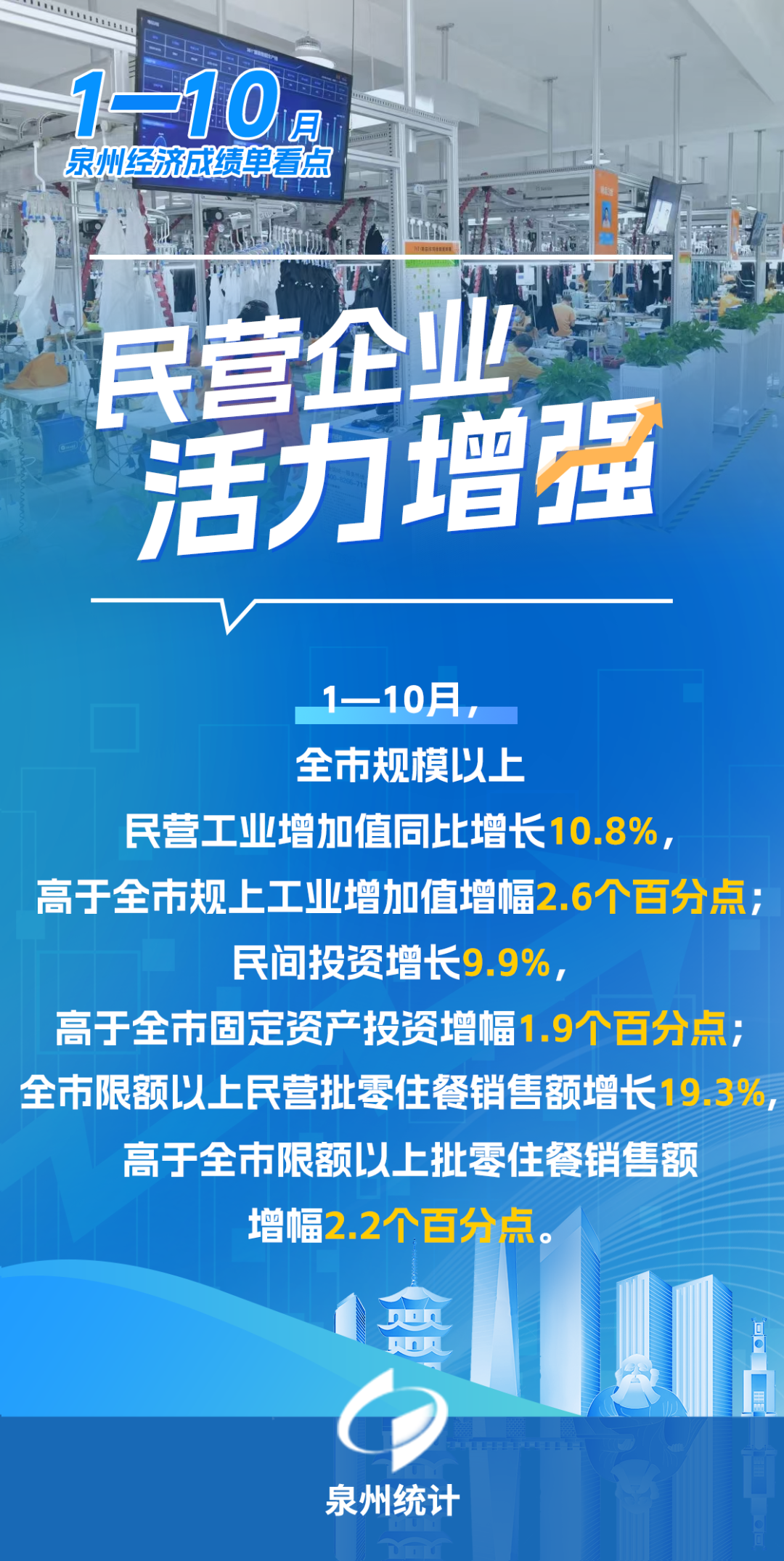 今年以来,泉州坚持稳中求进工作总基调,完整、准确、全面贯彻新发展理念,深化拓展“深学争优、敢为争先、实干争效”行动,坚持“稳一优二强三”战略思维,新质生产力加快形成,高质量发展扎实推进。1—10月,全市经济运行总体平稳、稳中提质。