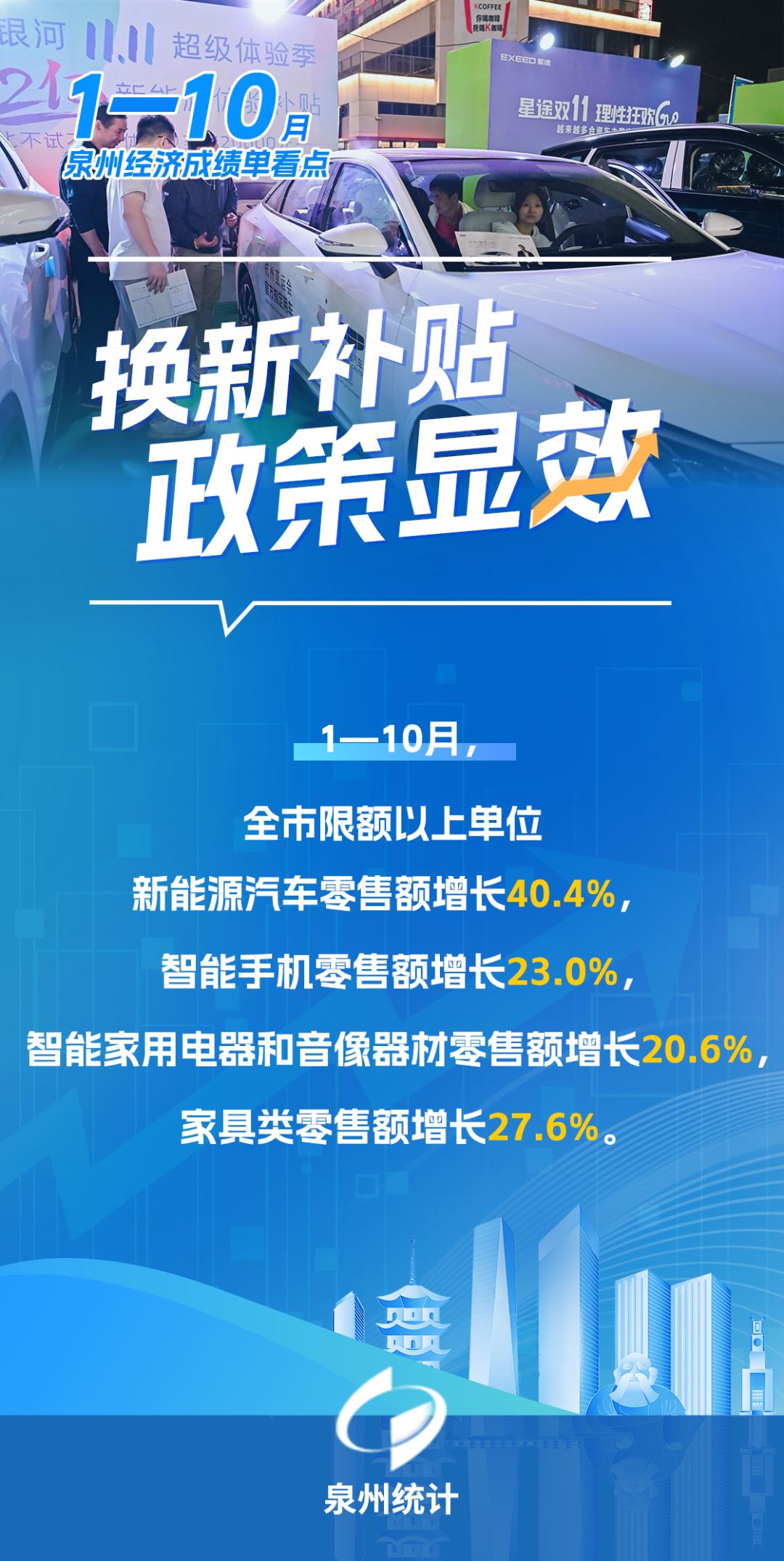 二是补贴消费品类增长明显。1—10月,全市限额以上单位新能源汽车零售额增长40.4%,智能手机零售额增长23.0%,智能家用电器和音像器材零售额增长20.6%,能效等级为1级和2级的商品零售额增长13.1%。