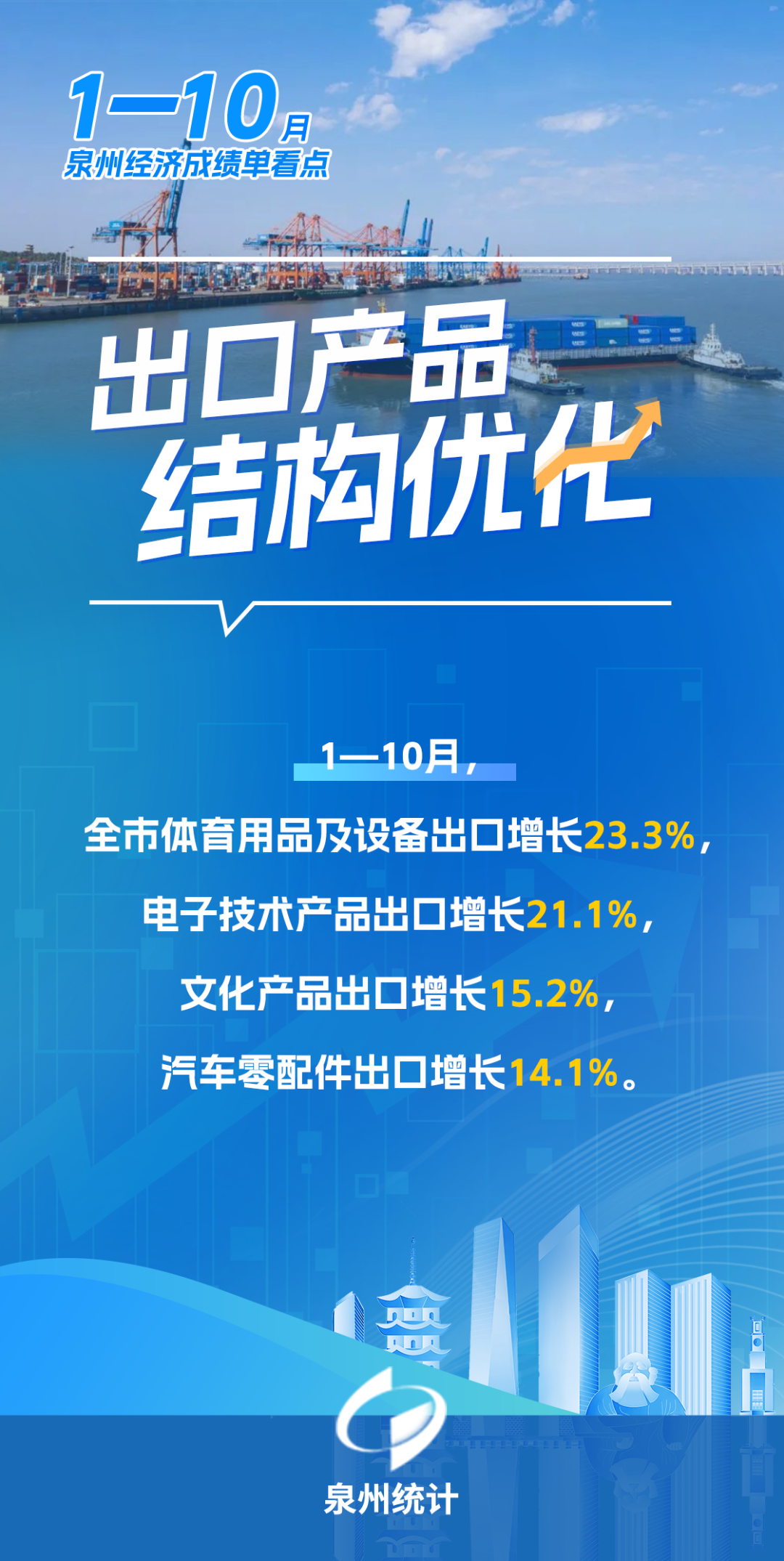 三是出口产品优化升级。1—10月,全市体育用品及设备出口增长23.3%,电子技术产品出口增长21.1%,文化产品出口增长15.2%,汽车零配件出口增长14.1%。